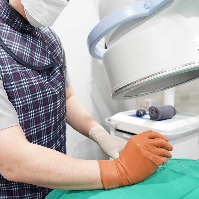 ![]() | 약물을 주입 컴퓨터 영상장치(C-arm)를 확인하면서 주사바늘을 관절강 내에 둔채 약물을 주입합니다. |