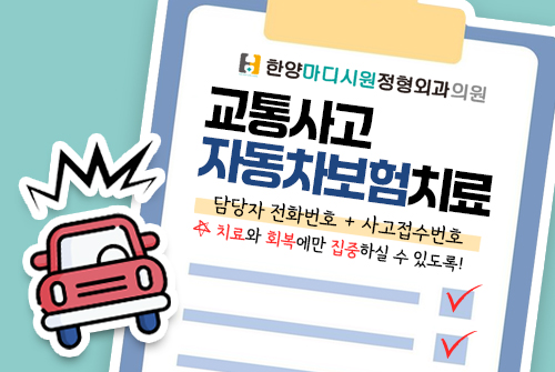 자동차 사고로 인해 부상을 입었다면, 한양마디시원정형외과에선 교통사고 후 자동차 보험으로 접수 가능합니다.